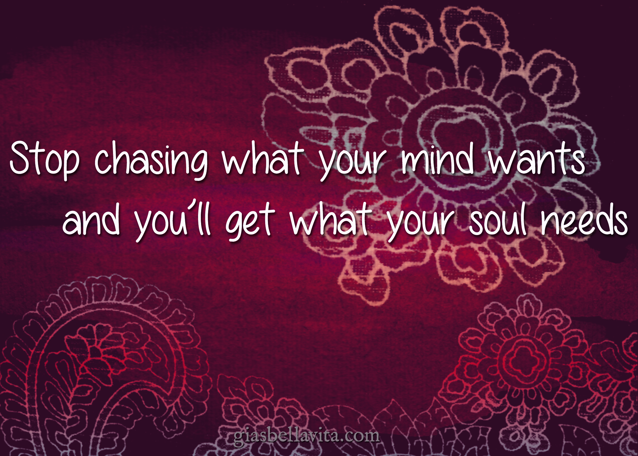 Do we live the life our mind tells us we want, or do we nourish what our heart and soul needs? My mind wants so many things, but my body doesn’t always want to cooperate. Then there is also the financial issues of living with metastatic cancer. I am so grateful for the life I have and know I’m blessed, but the adventurer in me feels suffocated. Many things in my life weigh on me to the point I can’t breathe. I spend endless hours thinking of ways to ease my situation and there always seems to be a wall. I’m surprised my face isn’t flat from slamming into the walls in life, but thinking on the positive side there is always a way around them or a different direction to take. I saw this quote and it spoke to me. “Stop chasing what your mind wants, and you’ll get what your soul needs” Designing the background for it, quieted my mind. It felt good. Every day I will practice letting go, turning off the noise in my head, and just listen to my heart and soul.